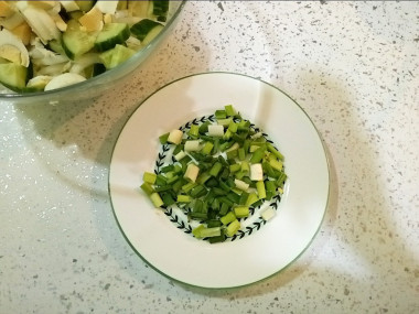 Перья зеленого лука промойте в проточной воде и немного промокните бумажным полотенцем, чтобы удалить лишнюю влагу. Нарежьте зеленый лук и добавьте его к салату.