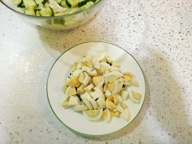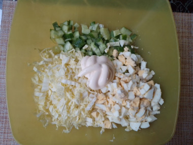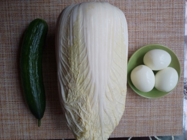В чаше для приготовления салата соедините нарезанные огурцы с пекинской капустой. Остывшие яйца очистите от скорлупы , нарежьте и добавьте в чашу к салату.