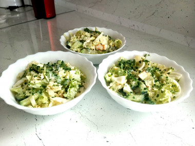 Очень вкусный витаминный салатик! Сегодня приготовила на завтрак. У меня ушла четвертинка пекинской капусты, один огурец и три яйца. Вместо зелёного лука положила шпинат, сверху украсила микрозеленью из семян чиа. На заправку ушло три столовые ложки майонеза. Майонез делала сама. Подробный рецепт можно посмотреть на моей страничке (фотоотчет). Это очень вкусный майонез, проверенный временем.
