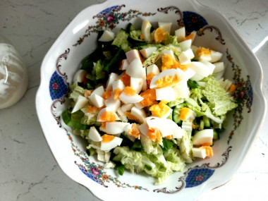 Яйца отварила заранее, залила холодной водой и остудила. Осталось только нарезать их четвертинками, так же как и огурец. Огурец у меня был с гладкой, нежной кожицей. Но если она грубая, то лучше счистить. Капусту нарезала не очень длинной лапшой. Ее получилось довольно много. Салат дополнила зеленым луком, слегка посолила и заправила майонезом.