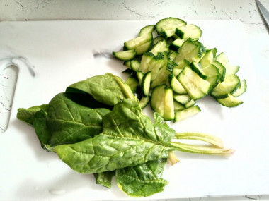 Четвертинку капусты я разрезала посередине вдоль, а затем некрупно нашинковала. Огурчик порезала соломой, яйца - крупными кубиками. Добавила порезанный шпинат, майонез, немного посолила, украсила микрозеленью и вуаля, полезный салатик готов. Это невероятно вкусно! Этой порции салата хватило на три большие пиалы.