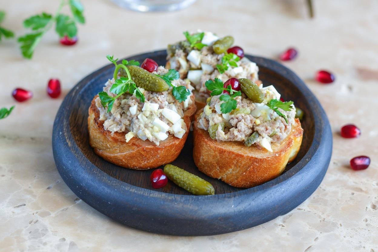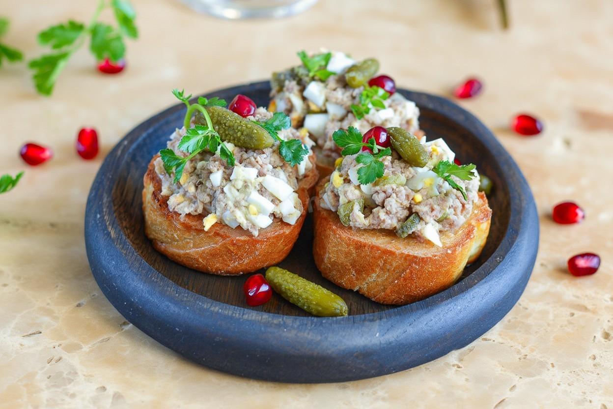На подсушенный хлеб выложить по 1-2 столовые ложки начинки.Шаг 14: