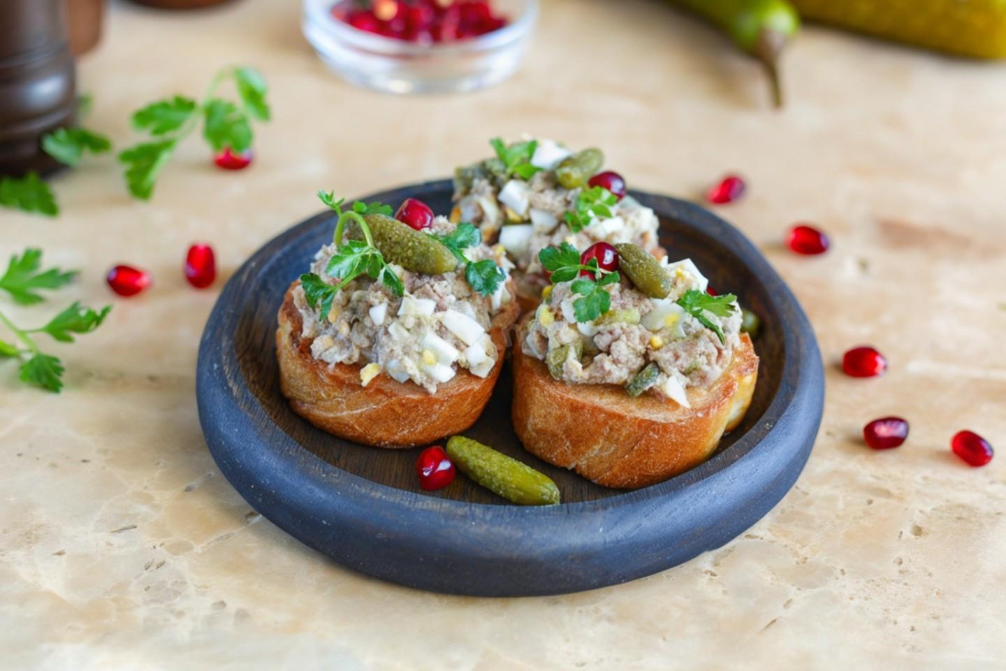 Украсьте бутерброды корнишонами и кинзой и подавайте к столу. Выкладывать начинку на хлеб лучше непосредственно перед подачей к столу, чтобы багет не размок и остался хрустящим. Приятного аппетита!