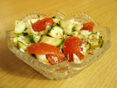 Огурцы, капуста, помидоры - вроде бы обычный набор продуктов. Но когда на улице конец декабря свежие овощи воспринимаются как-то по-особенному. Описывать вкус салата не имеет смысла, он знаком каждому, но мне он показался слегка пресноватым. Прочитала в комментариях, что некоторые хозяйки добавляли лук, я же использовала бальзамический уксус, с ним вкус стал более сбалансированным. Спасибо за рецепт, MariaS.