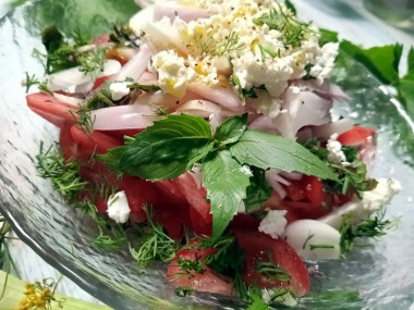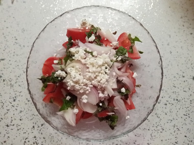 Помидоры нарезала небольшими кусочками, лук - полукольцами, базилик крупно нарубила ножом, нарезанные овощи сложила в салатник. Салат присолила, поперчила, добавила немного растительного масла и аккуратно перемешала. Сверху выложила сыр сиртаки, нарезанный кубиками. Салат получился очень сочным за счет вкусных спелых помидоров и ароматно-базиликовым! А сыр внес свою изюминку - легкую кислинку и сливочность. Просто восхищение для любителей базилика! Очень рекомендую к приготовлению!