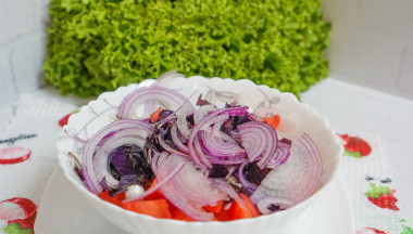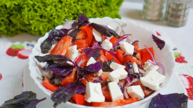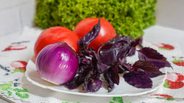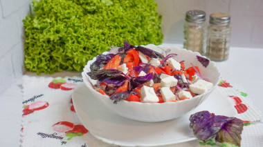 Нам очень понравился салат с базиликом помидорами и сыром! Он невероятно душистый благодаря свежим листикам базилика. И вообще помидоры, салатный лук и базилик прекрасно сочетаются. Для заправки я взяла зерненый творог и полила его нерафинированным маслом. Да ещё сверху смесью перцев присыпала. Оставила настаиваться на пол часа. Очень вкусно получилось! Летом такие салатики я подаю на ужин в качестве гарнира, это и вкусно и полезно.