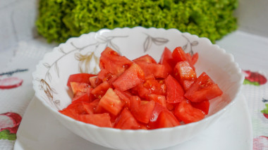 В глубокую чашу или салатницу выложите помидоры и нарезанный репчатый лук.