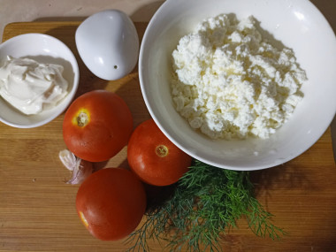 Как сделать помидоры, фаршированные творогом и чесноком?Подготовьте все продукты. Конечно, лучше готовить такую закуску в сезон овощей, когда помидоры свежие и ароматные. Если же вы готовите его зимой, то помидоры старайтесь брать помясистее, но я всегда ориентируюсь при выборе на их запах и беру самые ароматные. Для этой закуски помидоры должны быть достаточно большого размера, хотя можно взять и черри, если вы готовите для фуршета. Зелень подойдет любая
