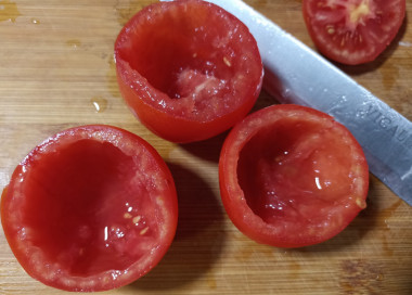 Удалите серединку, оставив стенки средней толщины. Сами помидоры солить не надо, а то они выделят много влаги и закуска будет излишне водянистой.