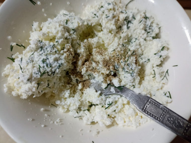 Чеснок почистите,измельчите и также добавьте к творогу. Я натираю чеснок на мелкой терке, но можно измельчить его с помощью ножа или пропустить через пресс. При отсутствии свежего чеснока можно использовать чесночный порошок.