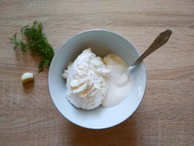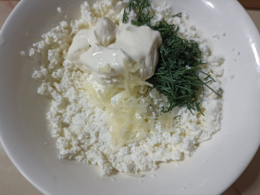 Творог для этого блюда можно использовать любой, в идеале.- домашний: отлично подойдет и обезжиренный творог, и даже зерненый. Если у вас мягкий творог, то можно уменьшить количество сметаны. Главное, чтобы масса хорошо держала форму. Сметану также можно заменить нежирным йогуртом. Смешайте творог и сметану, немного посолите массу. Можете добавить немного своих любимых специй: кто-то любит поострее, - можно использовать острый перец или сладкую паприку.