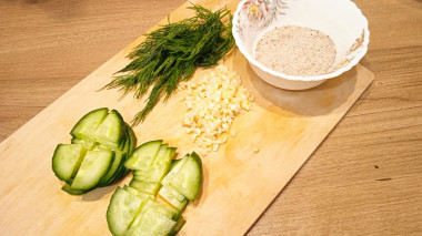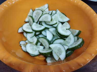 Отрежьте у огурцов попки. Нарежьте его полукружками. В принципе, можно использовать любой вид нарезки от тонким кружков до мелких кубиков - на вкусе это никак не отражается.