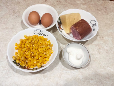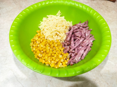 Яйца отварила,остудила и порезала небольшими кубиками. Колбасу порезала соломкой,с кукурузы слила жидкость,сыр натерла на крупной тёрке.