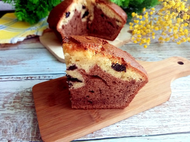 У меня как раз остался творог, который надо было куда-то пристроить. Тесто я замешивала миксером, крупинки творога полностью не разошлись, но нам это не важно. Яиц я взяла два небольших и муки у меня ушло на одну ложку больше. В одну часть добавила какао, а в другую изюм. Изюм предварительно промыла, обсушила и обваляла в муке, чтобы он лучше распределился в тесте. Выпекала кекс в небольшой металлической форме. Сначала выложила шоколадное тесто, затем белое. По времени получилось 50 минут. Кекс переворачивать не стала, ведь у него получилась замечательная верхушка). Остывал он медленно, завернутый в два полотенца.