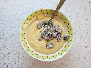 Разделить получившуюся массу на две равные части. В одну часть добавить изюм. Перемешать.