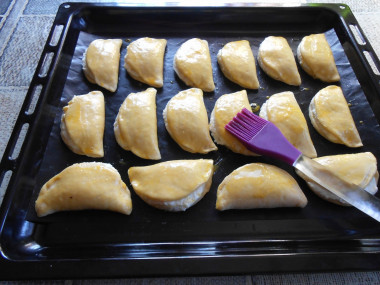 Смазываем сочни взбитым желтком и отправляем противень в разогретую до двухсот градусов духовку, затем сразу переключаем температуру духовки до ста восьмидесяти градусов и порядка тридцати пяти минут выпекаем сочни.