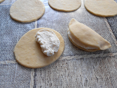 Выкладываем по одной столовой ложке приготовленной творожной массы ближе к краю каждой тестовой заготовки.