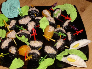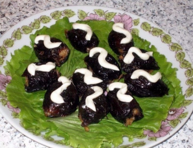 Интересный рецепт Чернослив фаршированный грецкими орехами закуски к празднику, фуршету. Вкус очень достойный. Отличная закуска на вечеринку, и подходит к некрепким напиткам. Немного утомительно начинять сам чернослив, но оно того стоит. Кстати, если вам некогда этим заниматься, то можно мелко нарезать чернослив, смешать с орехами, чесноком и майонезом и размешать до состояния пасты.