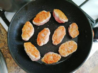 На сковороду налейте растительное масло и разогрейте его на среднем огне. Переложите на сковороду мититеи и обжарьте их со всех сторон до румяной корочки. Снимите сковороду с огня. Разогрейте духовку до температуры 180 градусов.