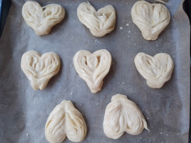 Лепёшку сверните в рулет. Рулет согните пополам, шов оставьте внутри, защипайте края. Разрежьте заготовку с противоположной от соединения стороны, делая надрез не до конца. Разверните булочку срезом вверх и осторожно расправьте слои. Так мы получим милые плюшки сердечком.