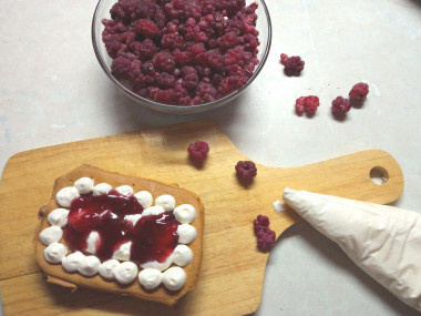 Готовый крем отсадите с помощью кондитерского мешка на медовые коржи. По желанию в центр можно добавить джем. Мне очень нравится сочетание с черной смородиной.