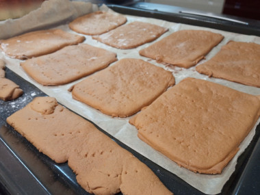 Раскатайте тесто на листе пергамента и формочкой вырезайте будущий размер пирожных. Лишнее тесто уберите. Поставьте в духовку, предварительно разогретую до 180 градусов, на 3-5 минут. Медовое тесто готовится очень быстро. Заготовки станут золотистого цвета. Остудите их. Количество готовых пирожных будет зависеть от выбранного диаметра заготовок.