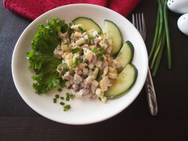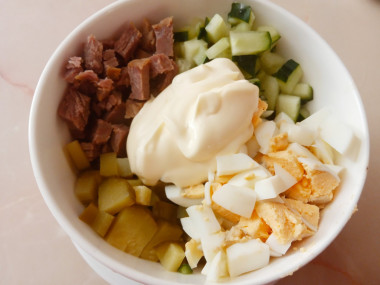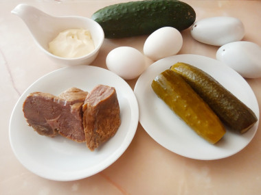 Приготовила салат с говядиной и маринованными огурцами. Варила говяжий бульон - кусочек говядины отложила для салата. Нарезала мясо, огурчики, яйца, заправила всё майонезом - салат готов! Нравятся мне салаты с небольшим количеством ингредиентов - готовить быстро и вкус каждого из продуктов , как говорится не "забивается". В этом салате понравилось сочетание продуктов. Сытно, вкусно. С удовольствием буду готовить ещё. Спасибо за рецепт, Наталья Цибульская!