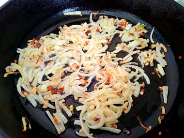Лук очистите, промойте и нарежьте на небольшие кубики. Нагрейте глубокую сковороду с толстым дном, аккуратно, чтобы не обжечься, вылейте на нее растительное масло и переложите измельченный лук. Жарьте на среднем огне, периодически помешивая, до мягкости. У меня заняло около 3 минут.