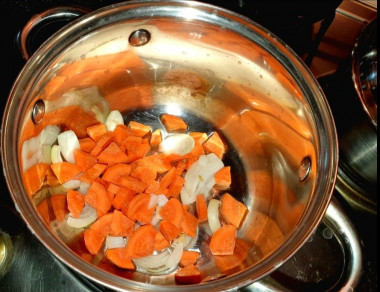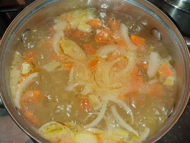 В кастрюлю для супа выложите картофель, морковь, стебель сельдерея и целую луковицу. Влейте литр воды. Поставьте кастрюлю на огонь, доведите воду до кипения и варите на среднем огне до готовности овощей около 30 минут. В конце варки лук выньте и выбросите.