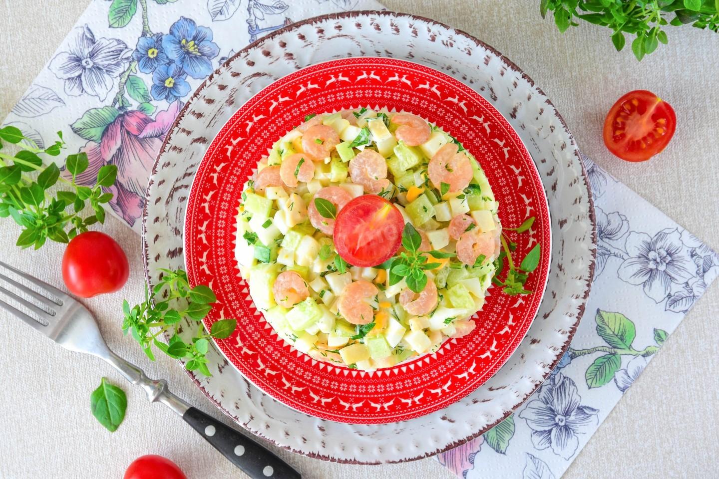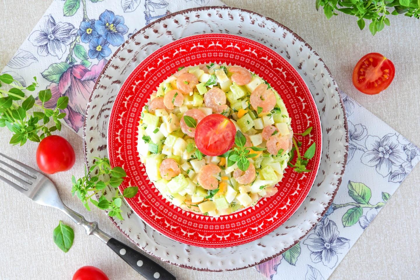 Креветки: для салата идеально подходят мелкие или средние очищенные креветки (коктейльные). Если берете варено-мороженые, отваривайте их 1 минуту, не больше.