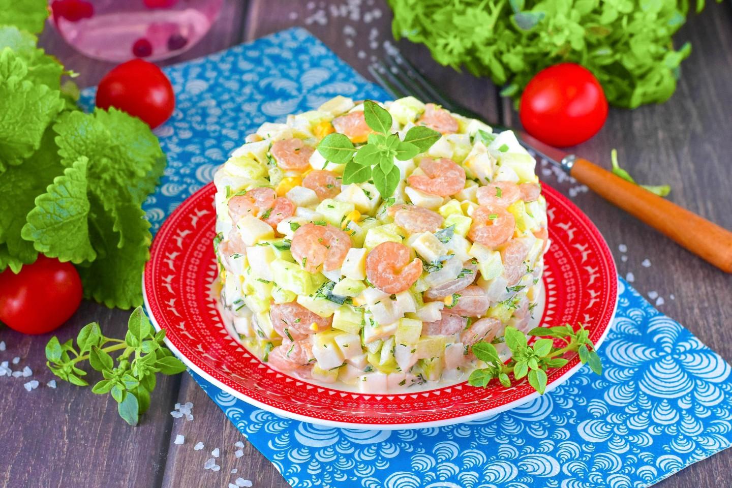 Салаты из отварных кальмаров стали популярны в советской кухне в середине XX века, когда начался промышленный вылов этого головоногого моллюска. Сочетание его с креветками и яйцом — классика домашней и ресторанной кухни, символ доступного, но праздничного блюда из «даров моря».
