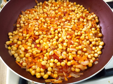 Это блюдо легко приготовить в мультиварке. Для этого горох не надо отдельно отваривать, а только замочить. В чаше обжарить овощи, добавить нут, воду и поставьте тушиться на час.