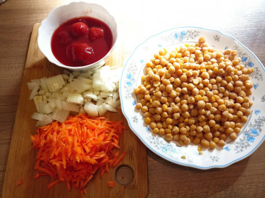 Как сделать нут, тушеный с овощами на сковороде? Подготовьте все необходимые продукты. Вместо томатного сока я использовала протертую мякоть томатов. Можно добавить и другие овощи - хорошо подойдет болгарский перец, кабачок, баклажан. Чтобы сделать вкус блюда более ярким, добавьте чеснок и любимые специи.