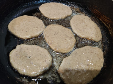 Разогрейте на сковороде две столовые ложки растительного масла. Много масла не лейте, чтобы котлеты не получились жирными. Выложите на сковороду по небольшому количеству фарша, формируя круглые или овальные лепешки. Я выкладывала деревянной ложкой одинаковое количество фарша, чтобы котлеты вышли одинаковыми по размеру. Жарьте с одной стороны на среднем огне около 3 минут.