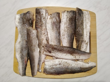 Тушки хека разделайте на филе. Как правильно разделать целую рыбу на филе? Удалите хвост, голову и плавники. Вдоль хребта прорежьте тушку до позвоночника. Острым ножом срежьте мясо с хребтовой кости. Переверните тушку и срежьте филе с другой стороны. Очистите изнутри, убрав черную пленку, так как она горчит и испортит вкус. Промойте и обязательно хорошо обсушите.