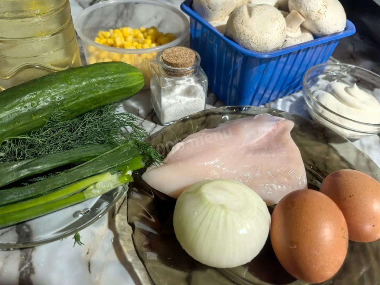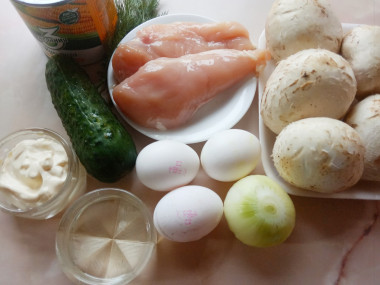 Как сделать салат Зодиак с курицей и грибами? Подготовьте все необходимые ингредиенты.