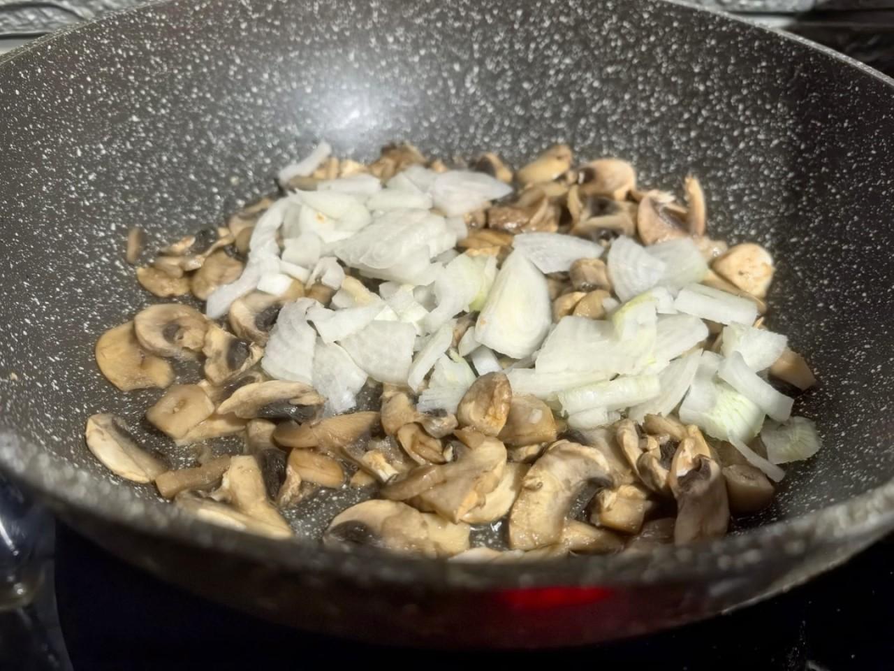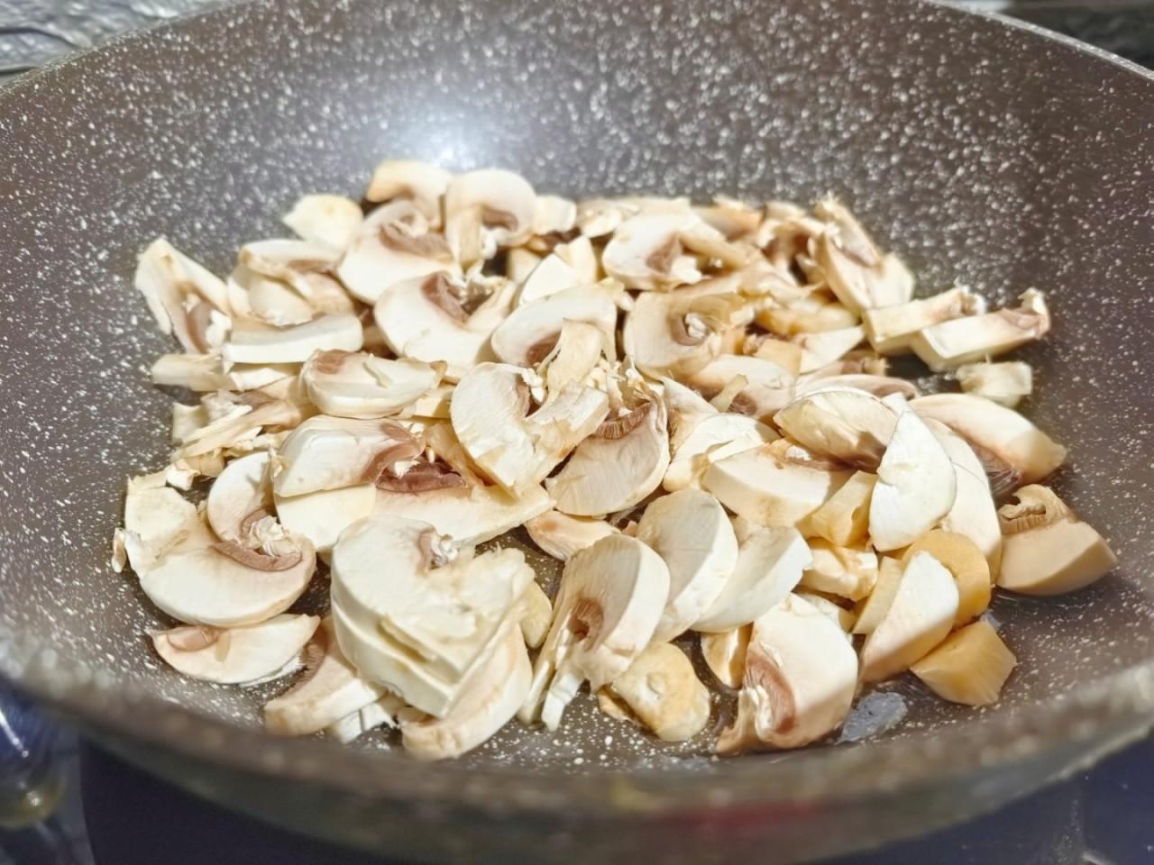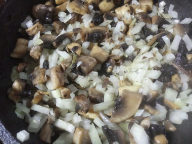 Шампиньоны тщательно промойте под проточной водой и обсушите на бумажных полотенцах. Каждый гриб разрежьте пополам, а потом тонкими ломтиками. Лук нарежьте мелким кубиком. Обжарьте грибы на сковороде с добавлением растительного масла.