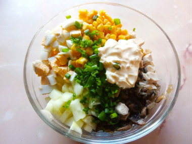 Отварила куриную грудку и яйца . Пока они остывали , начала жарить грибы . Когда вся влага ушла , добавила лук , и жарила грибы с луком до золотистого цвета. Далее нарезала остальные ингредиенты. Кроме укропа я добавила зеленый лук .Осталось лишь перемешать всё с майонезом.