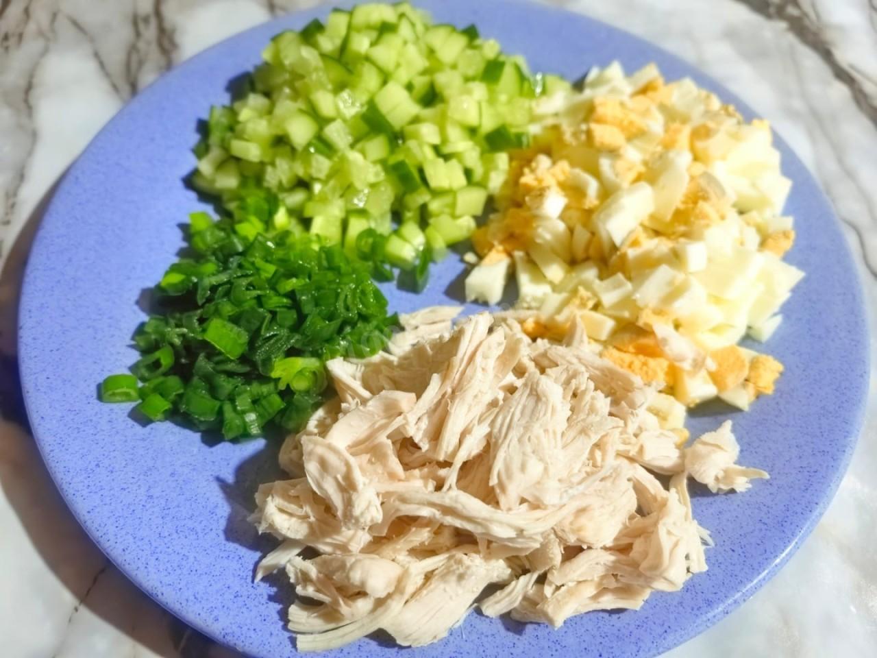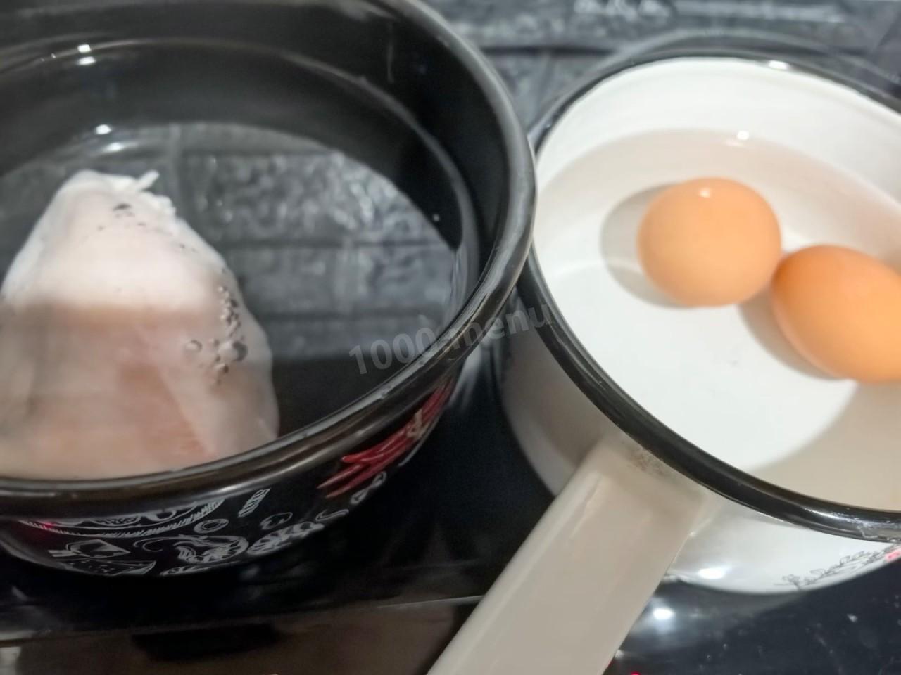 Отварите куриную грудку в подсоленной воде, добавив специи и лавровый лист по желанию. Точное время варки будет зависеть от размера филе. В среднем необходимо варить грудку 15-20 минут. Готовому мясу дайте полностью остыть прямо в бульоне, чтобы сохранить сочность. Яйца отварите вкрутую и остудите в холодной воде. как правильно выбирать и варить яйца читайте в конце рецепта. Остывшую курицу нарежьте кубиками или разделите руками на небольшие волокна.