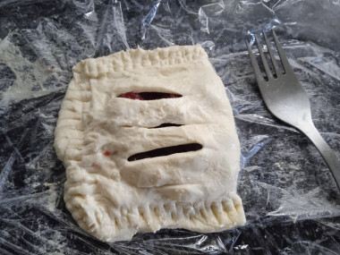 С помощью вилки придавите края слойки с трёх сторон. Работать нужно плоской стороной зубцов, довольно сильно прижимая края слойки друг к другу. Но будьте аккуратны, чтобы не продавить оба слоя насквозь. Иначе получатся слойки с симпатичной бахромой.