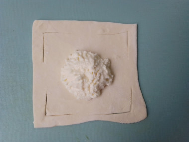 Выложите на середину квадратов теста творожную начинку. Ее лучше сразу разделить на равные части - по количеству слоек.