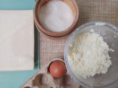 Как испечь слойки с творогом из слоеного теста? Подготовьте продукты по списку. Желательно брать слоеное тесто в квадратных пластинах - его не придется слишком сильно раскатывать, чтобы получить нужную форму и размер. Тесто заранее разморозьте. Творог берите не влажный и не сухой, жирность любая. Сырое яйцо вымойте и обсушите. Оботрите его бумажной салфеткой.