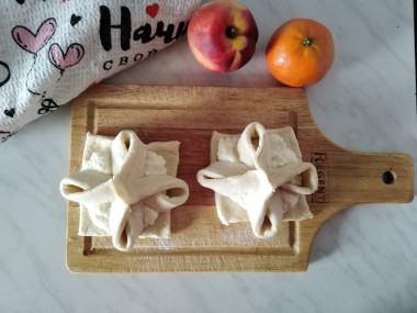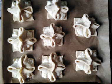 Разрезала каждый пласт теста на 4 части и сделала надрезы, как у автора. На мой взгляд, это самая удачная форма слойки с творогом - в виде цветка. Красиво и творог равномерно распределён.