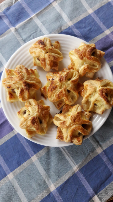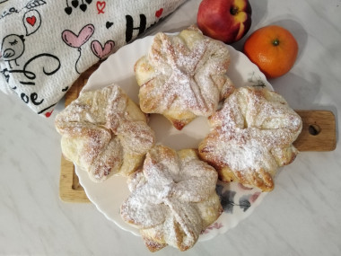 Очень красивая и очень вкусная выпечка! В начинку (творог прессованный 5 % 300 г и изюм) добавила пакетик ванильного сахара и чайную ложку обычного. 450 г теста разделила пополам, потом одну часть разделила на 4 квадрата, вторую раскатала более тонко и разрезала на 9. Первые получились больше по размеру, во вторых больше начинки по отношению к тесту. Но оба варианта оказались хороши. Сверху смазала яйцом, как в рецепте и присыпала смесью коричневого сахара и корицы. Аромат на весть дом! Сама слойка хрустящая, начинка сочная, к кофе просто великолепно. Рекомендую!