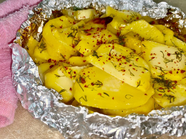 Я картофель положила в фольгу, вместо формы и соединила сверху, перед тем, как вынуть картофель открыла верх фольги, чтобы подрумянить картошку. Картофель в майонезе на любителя, у меня, к примеру, не все дома любят майонез, а также исходит специфический запах, но на вкус майонез почти не чувствуется.