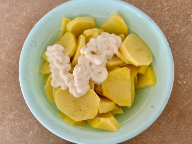 Очень простое в приготовлении блюдо Картофель в майонезе запеченный в духовке, всего-то нужно нарезать картофель и смешать с майонезом, посолить.