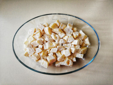 Картошку я нарезала кубиками, зубчик чеснока натерла на терке. Переложила их в глубокую тарелку, добавила майонез и соль. Из специй взяла итальянские травы. Перемешав всё, поместила картошку в форму для запекания и отправила ее в духовку.