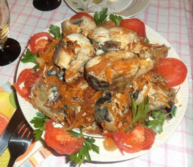 Скумбрия с луком и морковью готова! Рыба хорошо отходит от костей и очень вкусно пахнет! Разложите кусочки рыбы по тарелкам и подавайте к столу в горячем виде. Приятного аппетита!