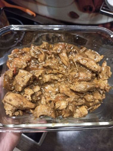 Почему-то соус не впитался в мясо и перец разварился.