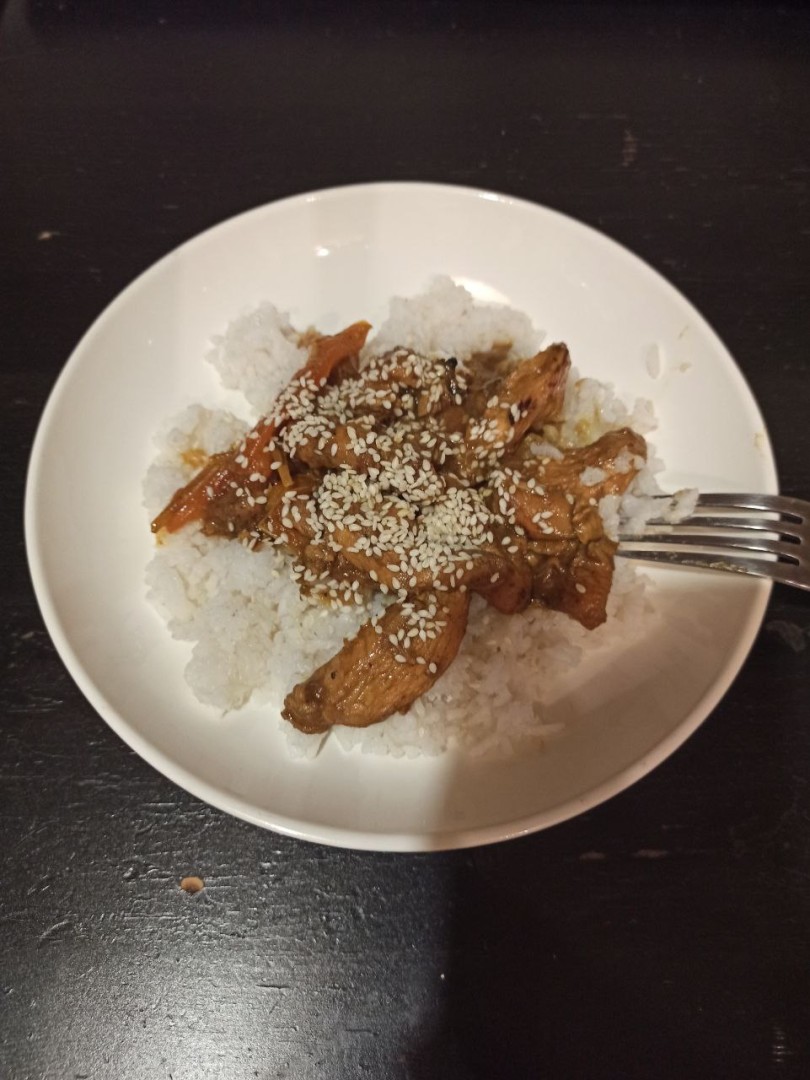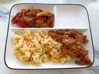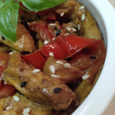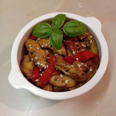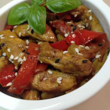 Наша курица в кисло-сладком соусе с болгарским перцем готова. При подаче можно посыпать готовое блюдо кунжутом. Приятного аппетита!